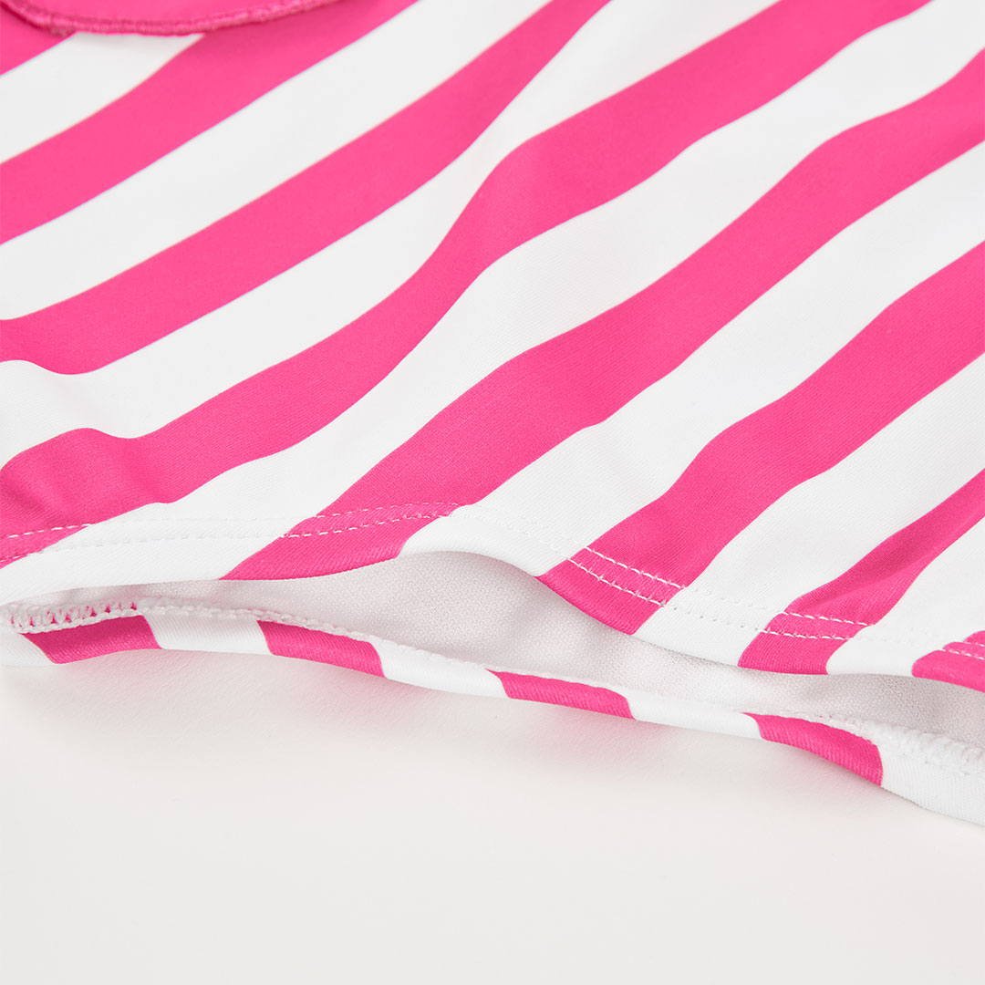 Este bañador para niña combina diseño, comodidad y un toque divertido para disfrutar del verano con estilo. Su estampado de rayas horizontales en rosa y blanco crea un look fresco y veraniego, perfecto para acompañar a las más pequeñas en sus días de playa o piscina.