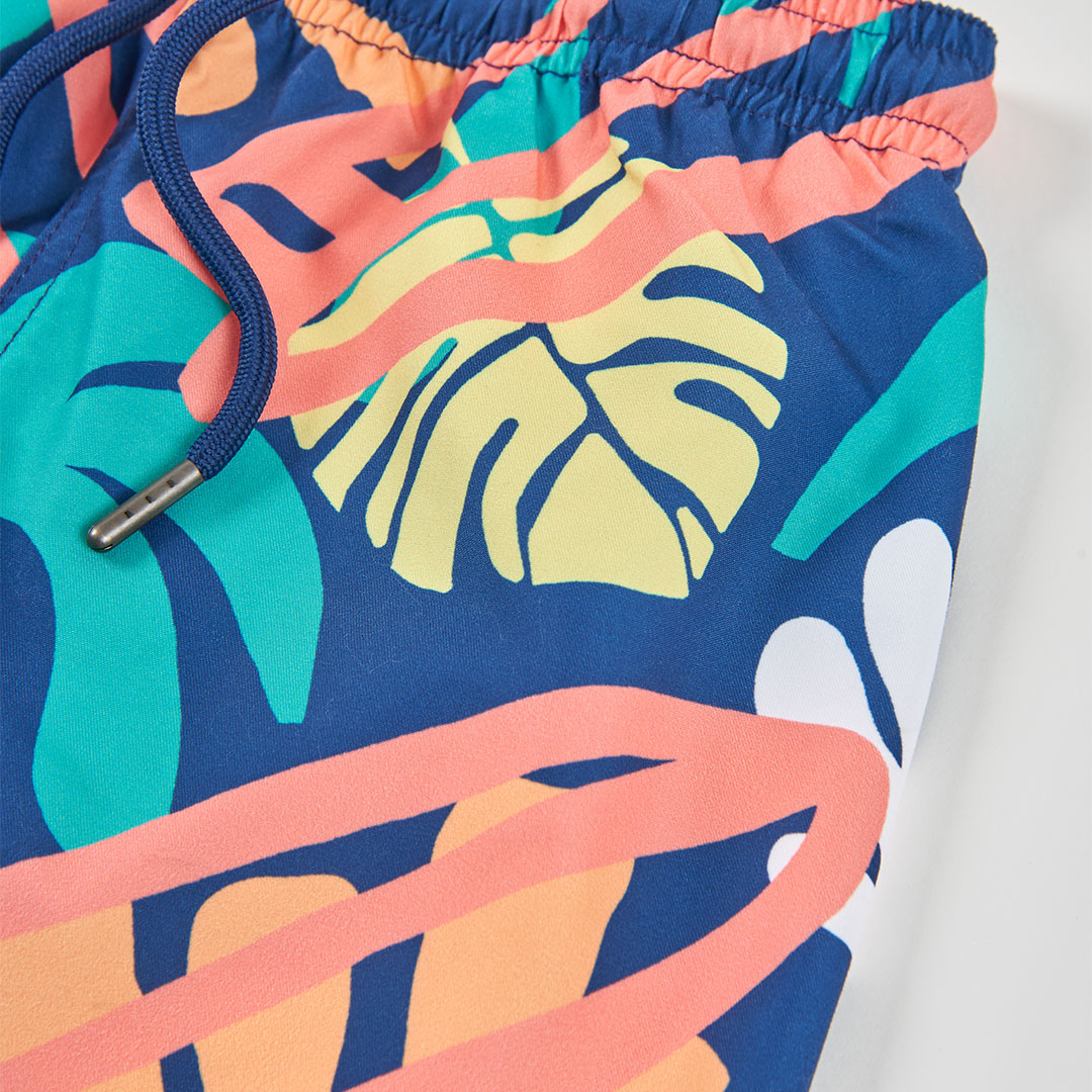 El modelo destaca por su estampado colorido de hojas y formas abstractas, que aporta un aire fresco y veraniego. Su estilo divertido lo convierte en una opción ideal para los niños que disfrutan del agua, el sol y los días al aire libre.