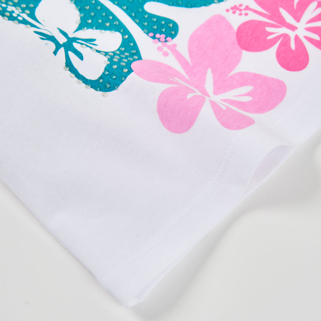 Confeccionada en suave tejido de punto blanco, resulta ligera y agradable al tacto, ideal para la piel de las niñas. Su estampado colorido con texto y flores aporta un toque divertido y veraniego que llena de vida cualquier look infantil.