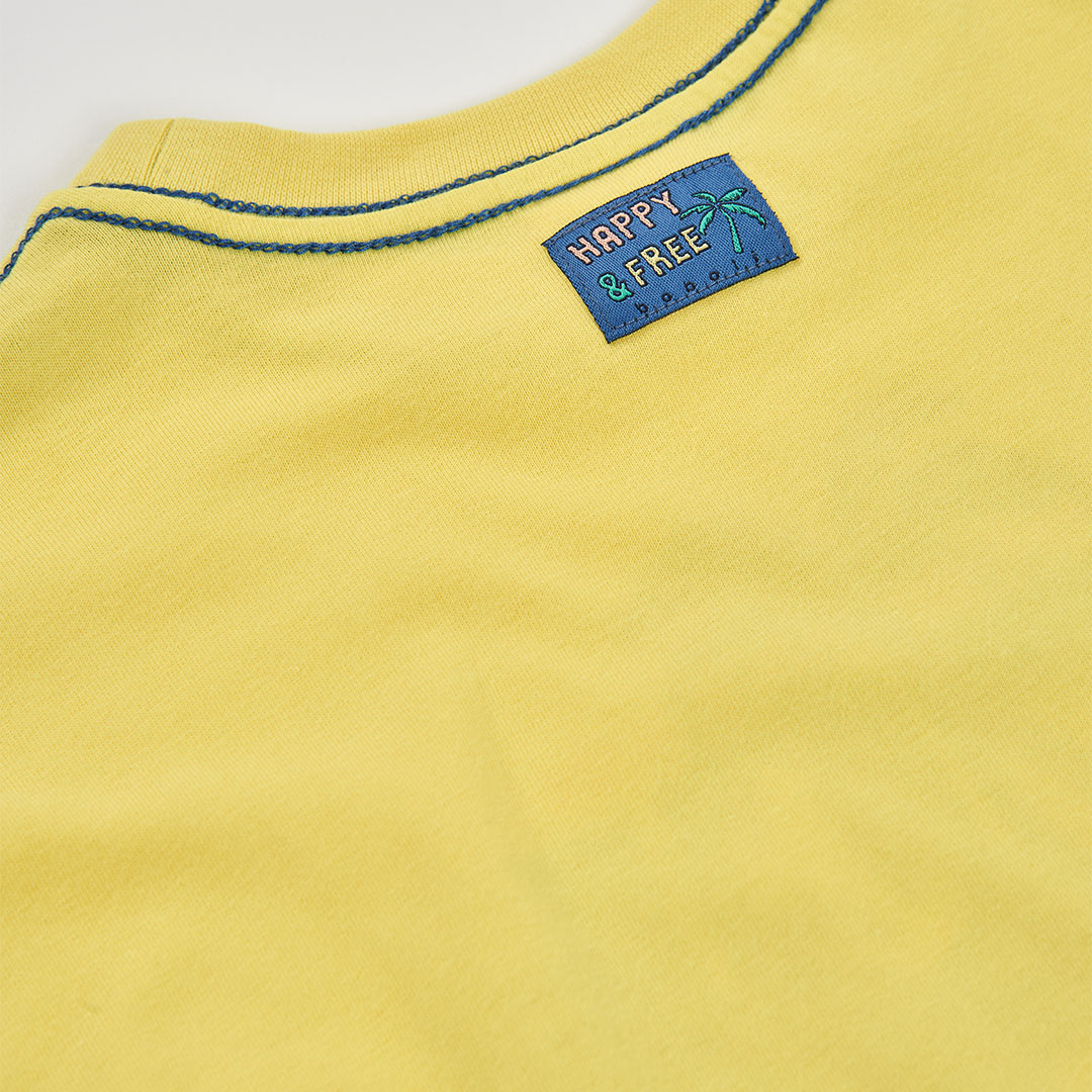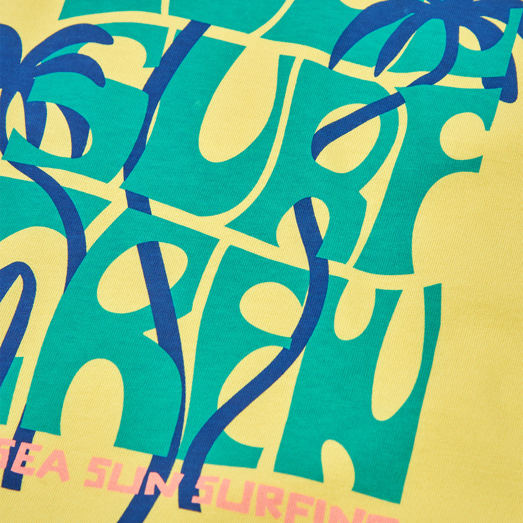 El diseño destaca por su estampado de palmeras y texto divertido, que aporta un toque veraniego y alegre al vestuario infantil. El color limón le da un aire luminoso y vibrante, convirtiéndola en una prenda que añade energía y estilo a cualquier conjunto.