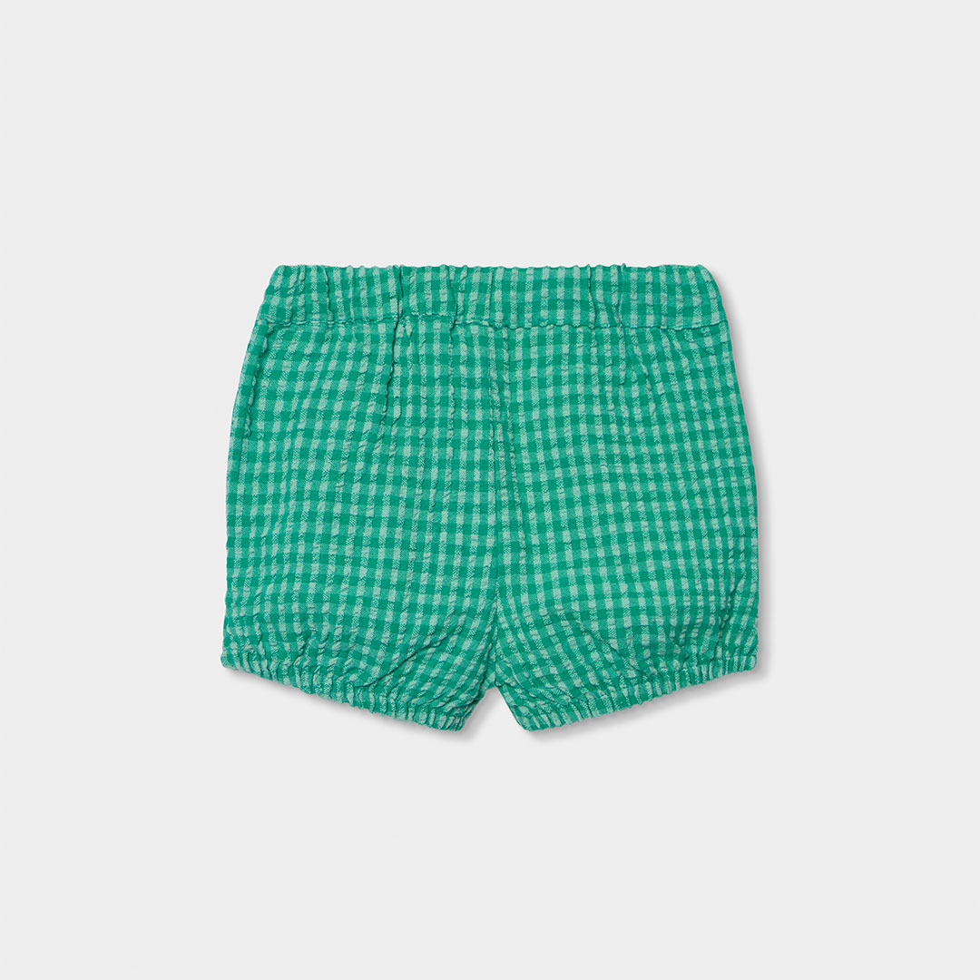 El conjunto combina una camiseta blanca de manga corta con un simpático diseño de animal en el frontal y un pantalón corto con estampado a cuadritos en tonos verdes, creando un look fresco, alegre y lleno de estilo. Su diseño cómodo facilita el movimiento del bebé y hace que sea una prenda perfecta para el día a día.