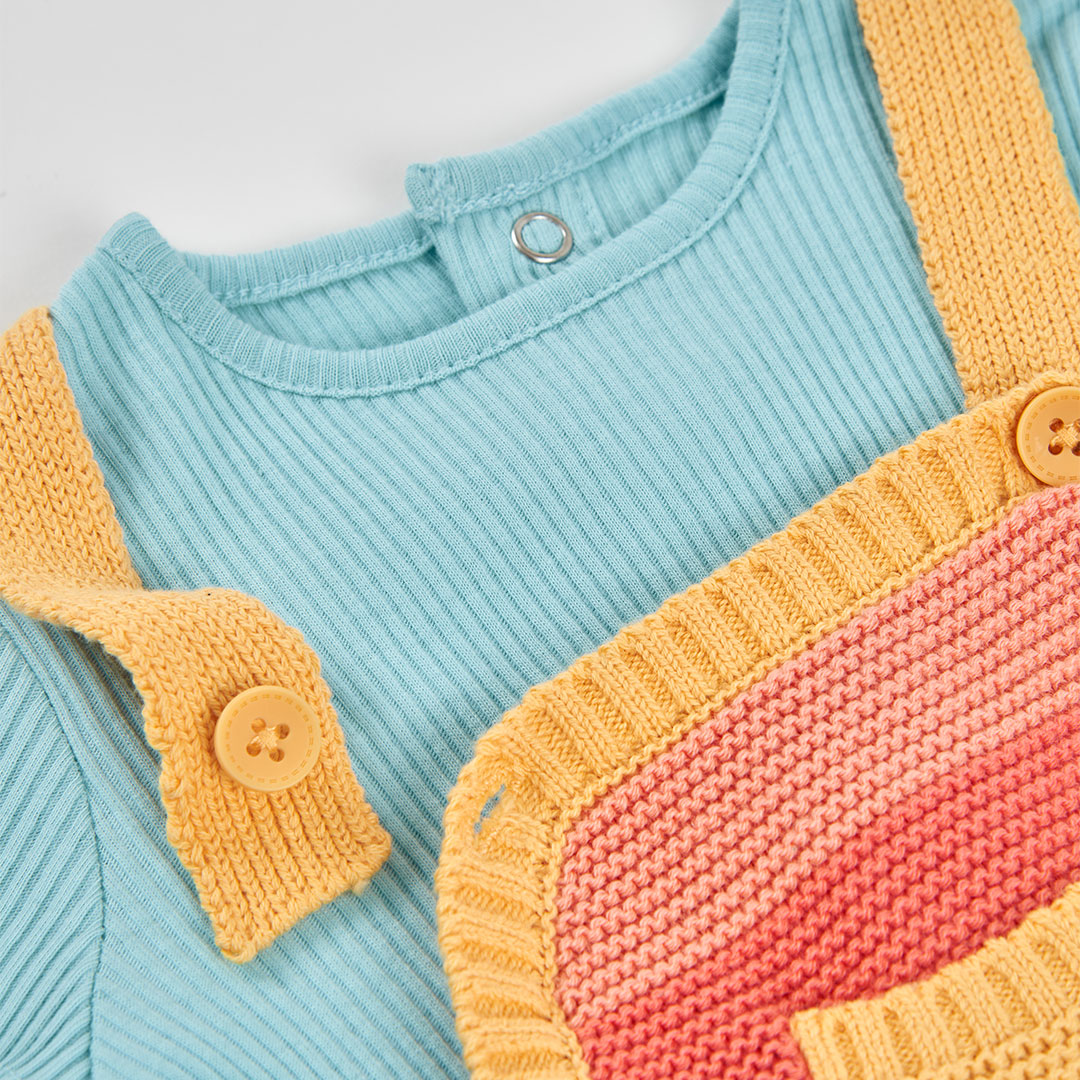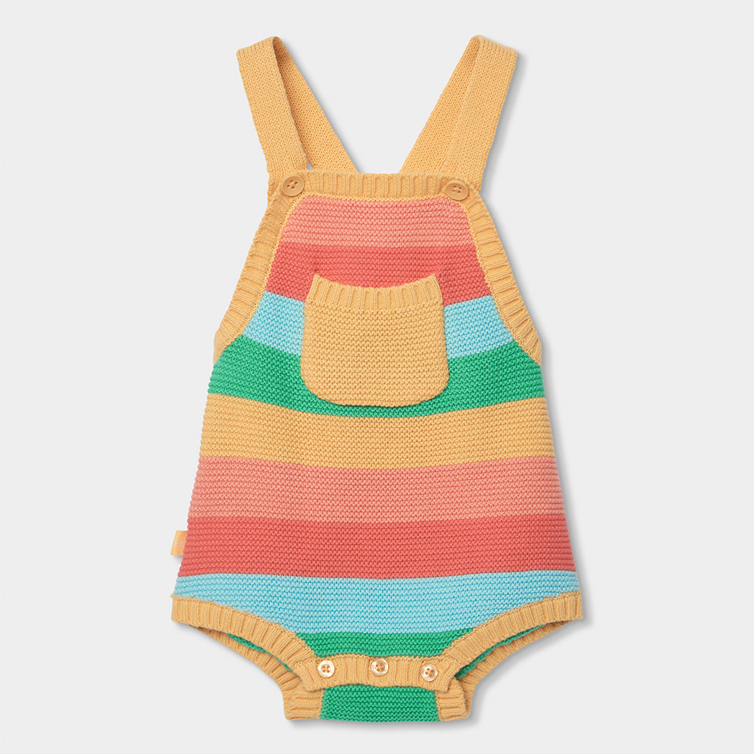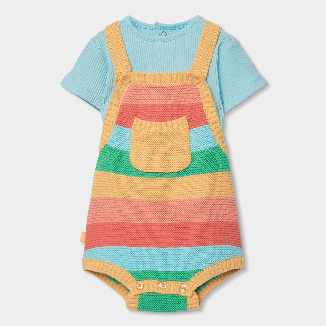La prenda principal es su peto de punto con rayas multicolor en tonos verde, rojo, amarillo y azul, un diseño alegre que aporta un toque fresco y moderno al conjunto. Gracias a su estilo colorido convierte este conjunto en una opción ideal para crear looks de bebé divertidos y llenos de personalidad.