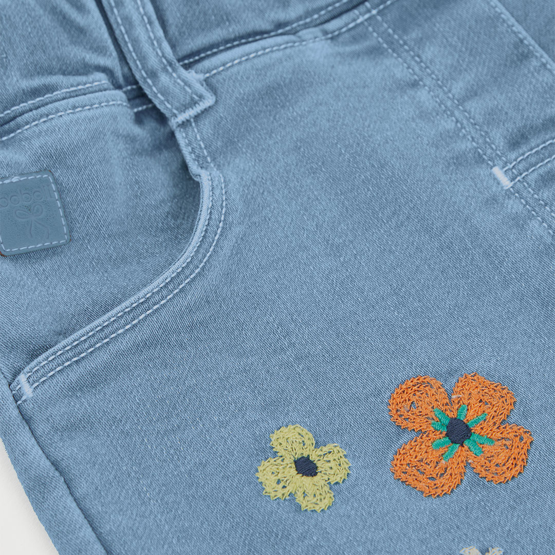 Confeccionado en tejido denim suave de color azul claro, ofrece un estilo moderno y versátil que resulta muy fácil de combinar con camisetas, blusas o sudaderas. Su diseño se distingue por unos bonitos bordados de flores multicolores, un detalle delicado y divertido que aporta personalidad y frescura al conjunto.