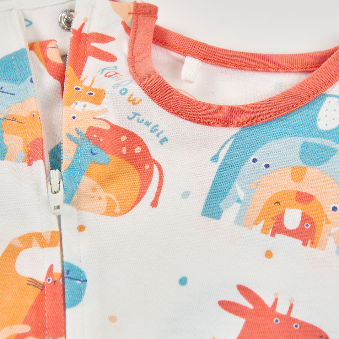 Confeccionado en tejido de punto suave y agradable al tacto. Gracias a esto cuida la piel delicada del bebé y ofrece la comodidad que necesita durante todo el día. Sus colores vibrantes como azul, naranja y rojo sobre fondo claro crean una combinación alegre y moderna, ideal para la temporada de primavera y los días más frescos del verano.