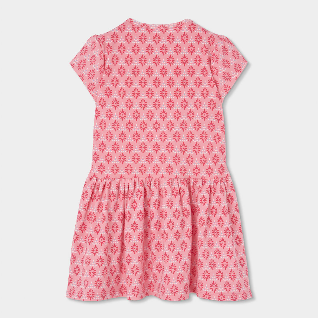 Este vestido de punto para niña es una prenda cómoda, versátil y llena de encanto, perfecta para el día a día. Su fondo rosa con estampado floral de inspiración étnica en color blanco crea un diseño delicado y alegre que aporta estilo al look infantil.