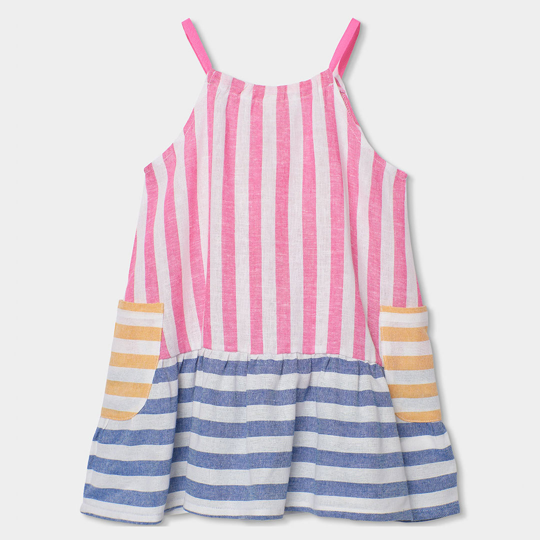 Este vestido infantil de popelín es una opción fresca, alegre y cómoda para los días más cálidos. Su estampado de rayas verticales en varios colores aporta un estilo divertido y veraniego que nunca pasa de moda, ideal para crear looks llenos de luz y personalidad.