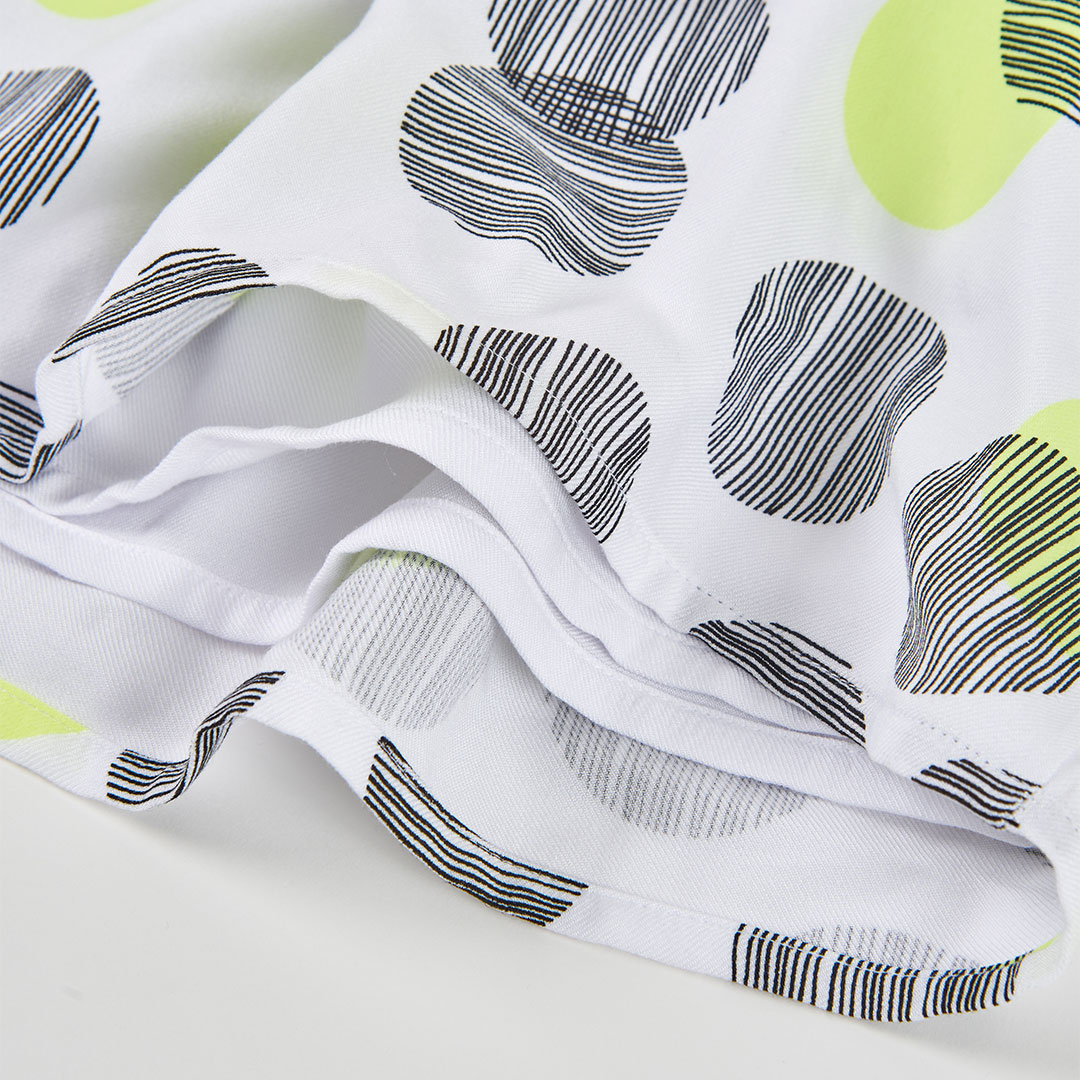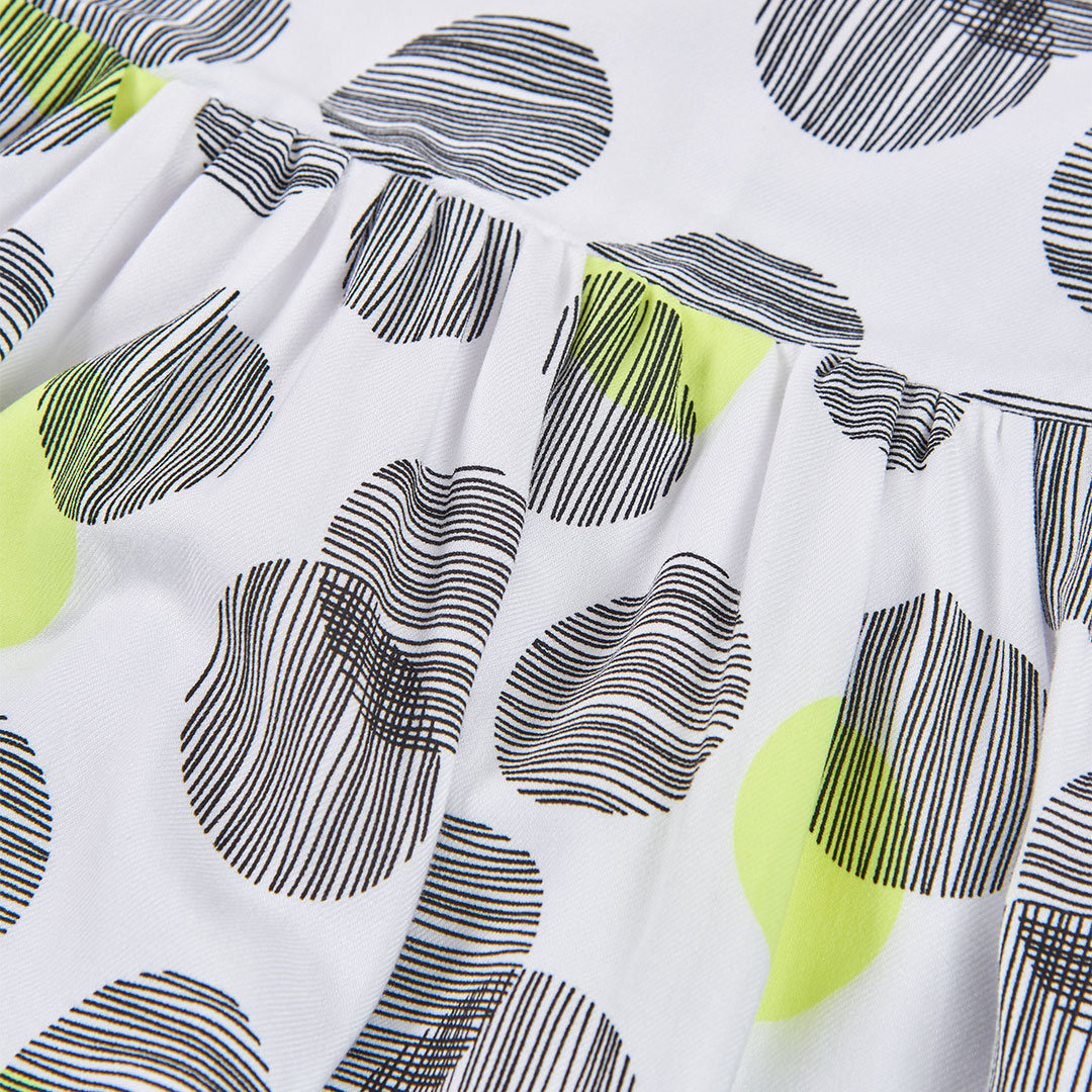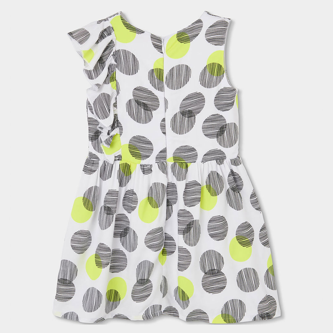 Este vestido para niña destaca por su diseño moderno y lleno de personalidad, con un original estampado de círculos en negro y verde neón sobre fondo blanco que aporta un toque divertido y actual al look infantil.