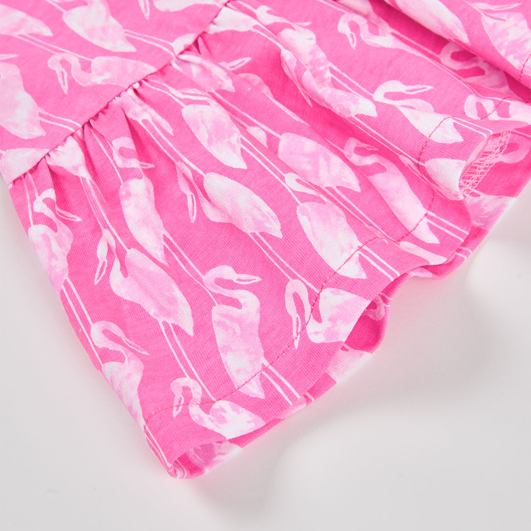 Confeccionado en tejido de punto suave y transpirable, este vestido garantiza frescura, ligereza y libertad de movimiento, algo esencial para que las niñas se sientan cómodas mientras juegan, pasean o disfrutan de cualquier actividad.