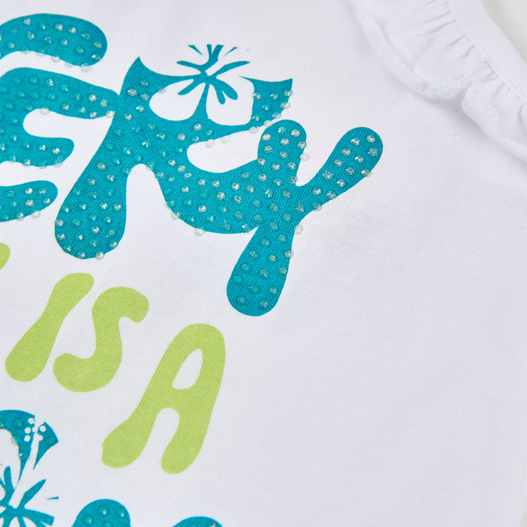 Confeccionada en suave tejido de punto blanco, resulta ligera y agradable al tacto, ideal para la piel de las niñas. Su estampado colorido con texto y flores aporta un toque divertido y veraniego que llena de vida cualquier look infantil.