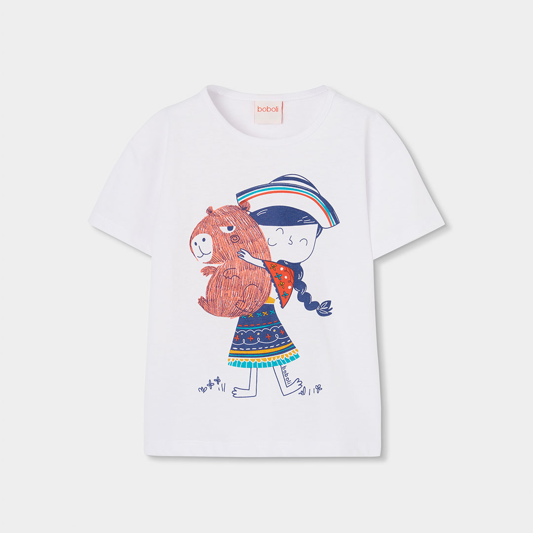 Su base en color blanco y fucsia la convierte en una prenda muy versátil, fácil de combinar con todo tipo de looks. Destaca por su bonito estampado de una niña con detalles coloridos, que aporta un toque divertido y delicado al conjunto. El diseño de manga corta y cuello redondo garantiza un ajuste cómodo y práctico, ideal para acompañar a las pequeñas en sus actividades diarias.