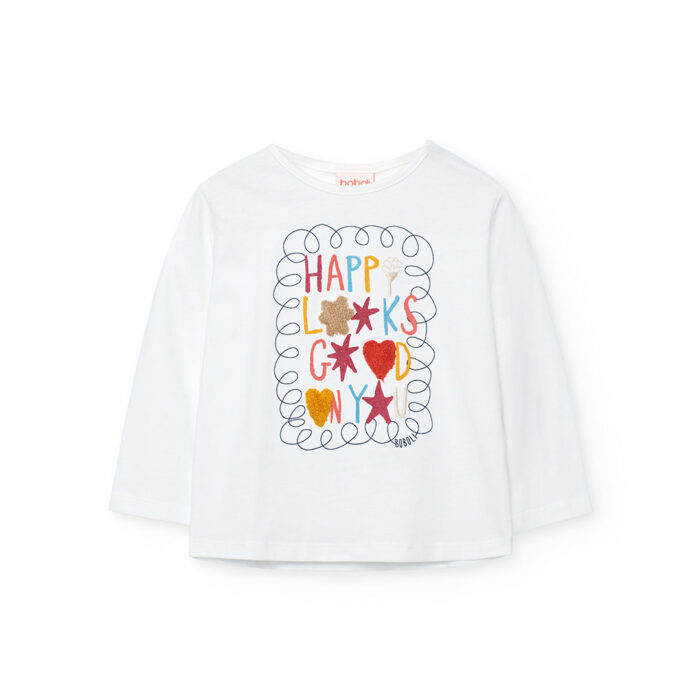 El diseño con letras divertidas y detalles coloridos en la parte frontal aporta un toque alegre y actual, perfecto para niñas con estilo propio. Su cuello redondo ofrece un ajuste cómodo y fácil de llevar en cualquier ocasión.