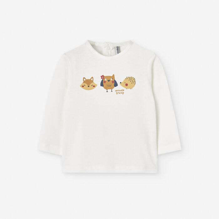 La camiseta Losan de manga larga con erizos para bebé niña es una prenda dulce, cómoda y llena de encanto. Confeccionada en algodón suave, su estampado delantero de erizos y el fondo en color crudo le aportan un estilo tierno y natural, perfecto para los primeros meses de tu pequeña.