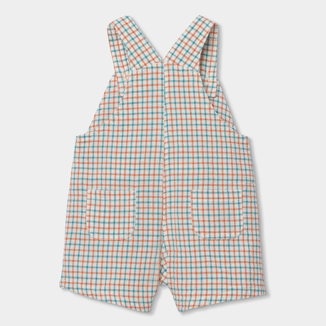 El diseño alegre presenta un patrón de cuadros acompañado de un simpático sol sonriente en el frontal, que aporta un toque encantador y moderno. La camiseta terracota de manga corta completa el conjunto, creando un look casual y versátil, perfecto para paseos, juegos o el día a día en familia.