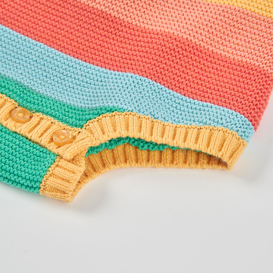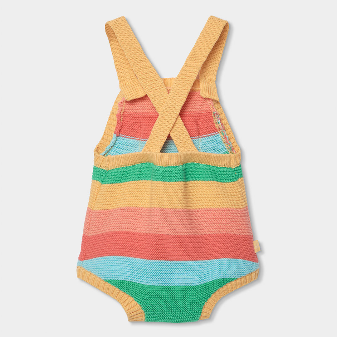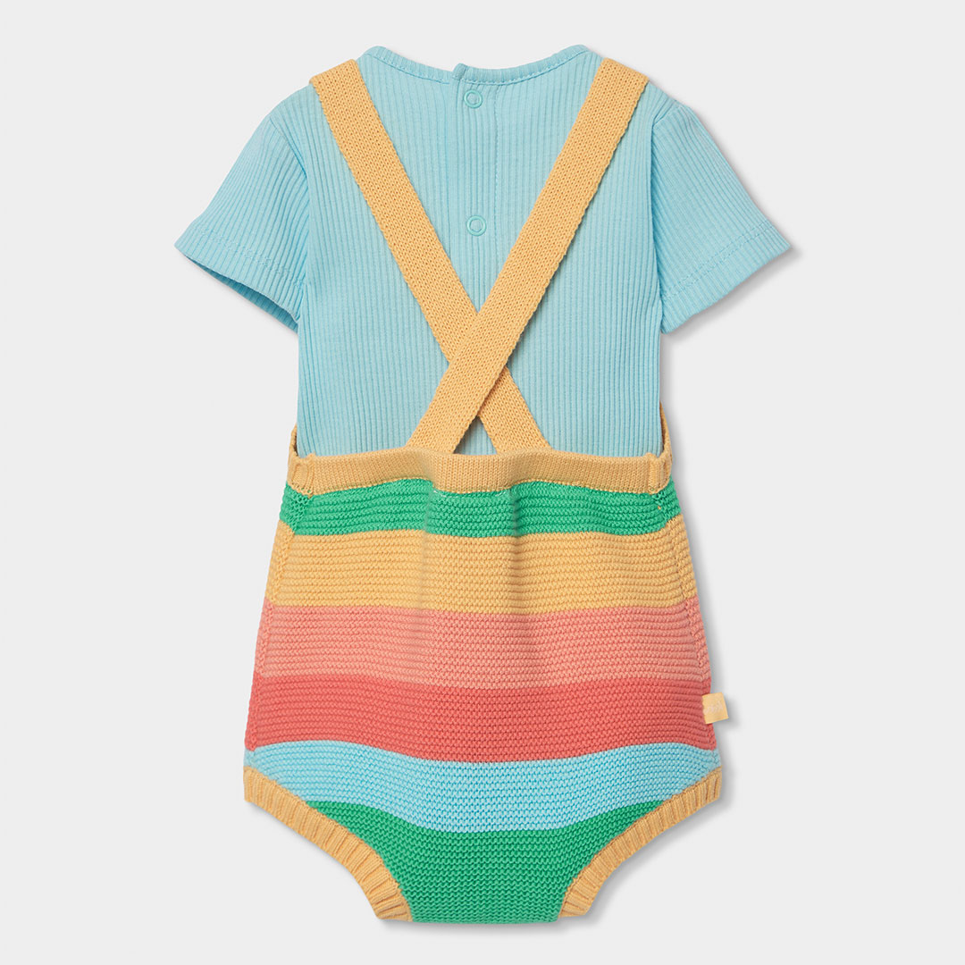 La prenda principal es su peto de punto con rayas multicolor en tonos verde, rojo, amarillo y azul, un diseño alegre que aporta un toque fresco y moderno al conjunto. Gracias a su estilo colorido convierte este conjunto en una opción ideal para crear looks de bebé divertidos y llenos de personalidad.