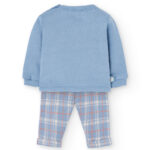 La sudadera de punto destaca por su original estampado. Los dibujos de animales y cuadros en tonos suaves crean un look tierno y alegre. El pantalón azul a juego completa el conjunto y aporta equilibrio al diseño. Además, se puede combinar fácilmente con otras prendas del armario infantil. Así tendrás un conjunto versátil para el día a día y también para ocasiones especiales.