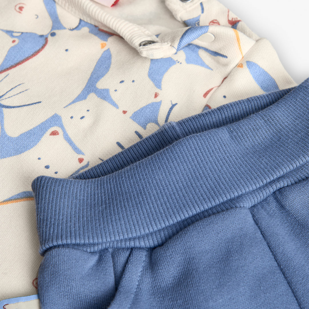 La parte superior luce un diseño alegre en tonos azul claro y crema, con adorables estampados de animales, que aportan un toque divertido y tierno. El pantalón azul uniforme completa el conjunto, creando un look coordinado que facilita vestir al bebé de manera rápida y estilosa. Es ideal para el día a día, pero también para pequeñas salidas o encuentros familiares.