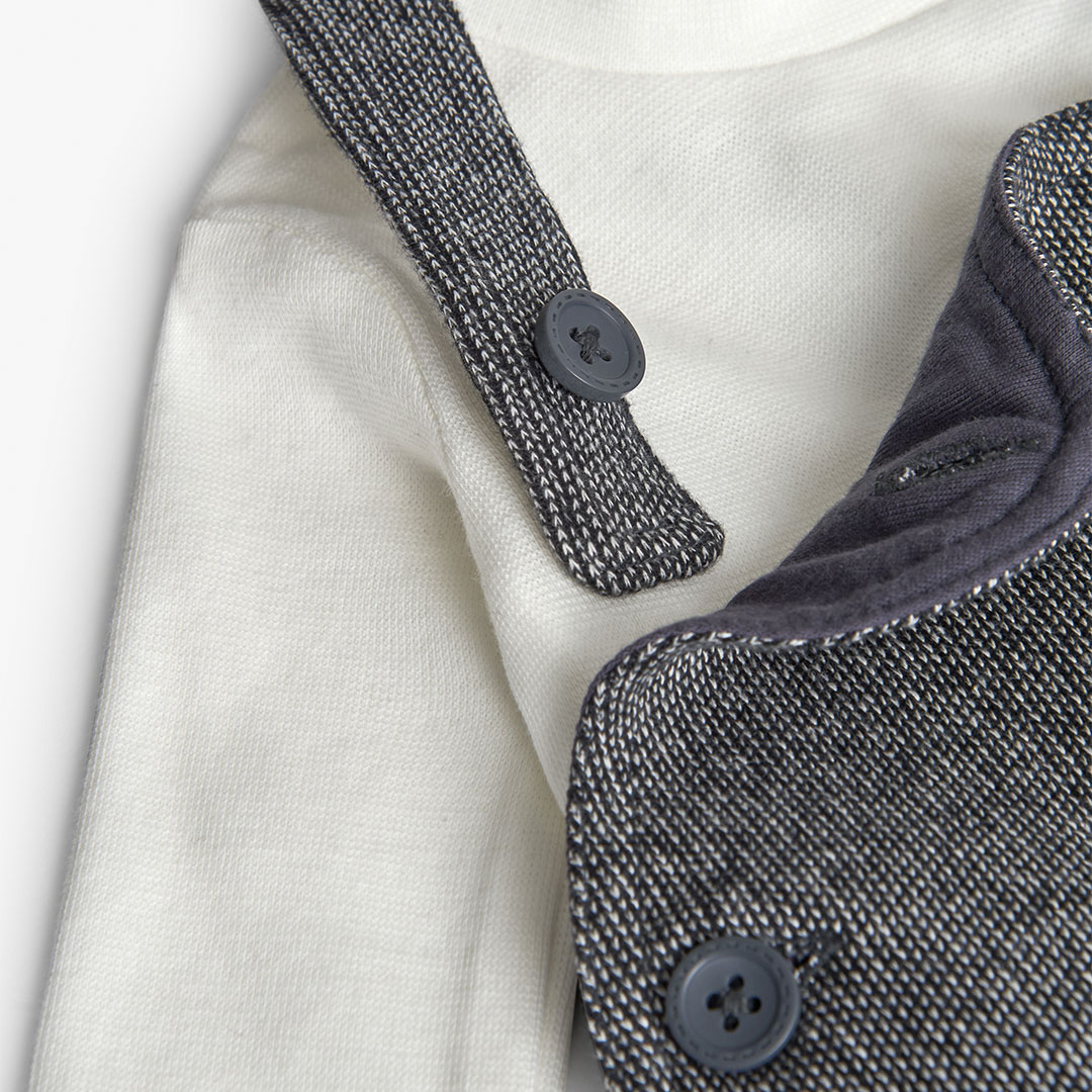 El conjunto incluye jersey y peto, pensado para mantener al bebé abrigado en cualquier temporada. Los botones en los tirantes y laterales del peto facilitan el cambio de ropa, haciendo la rutina diaria mucho más sencilla para padres y cuidadores.