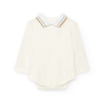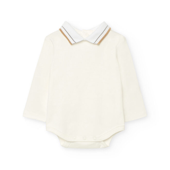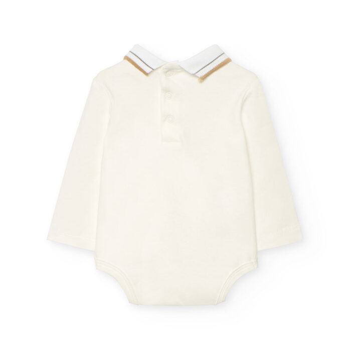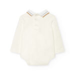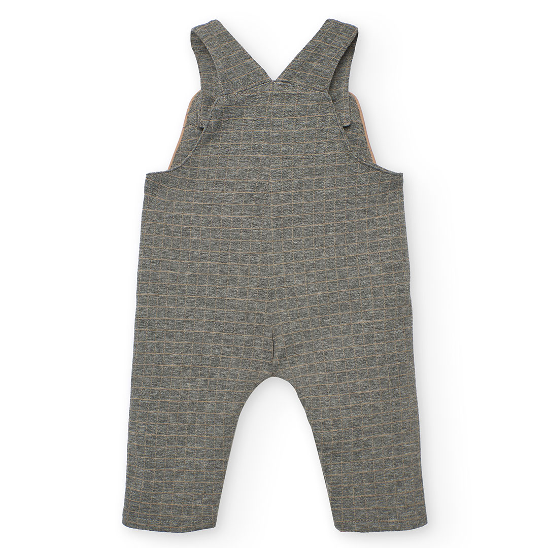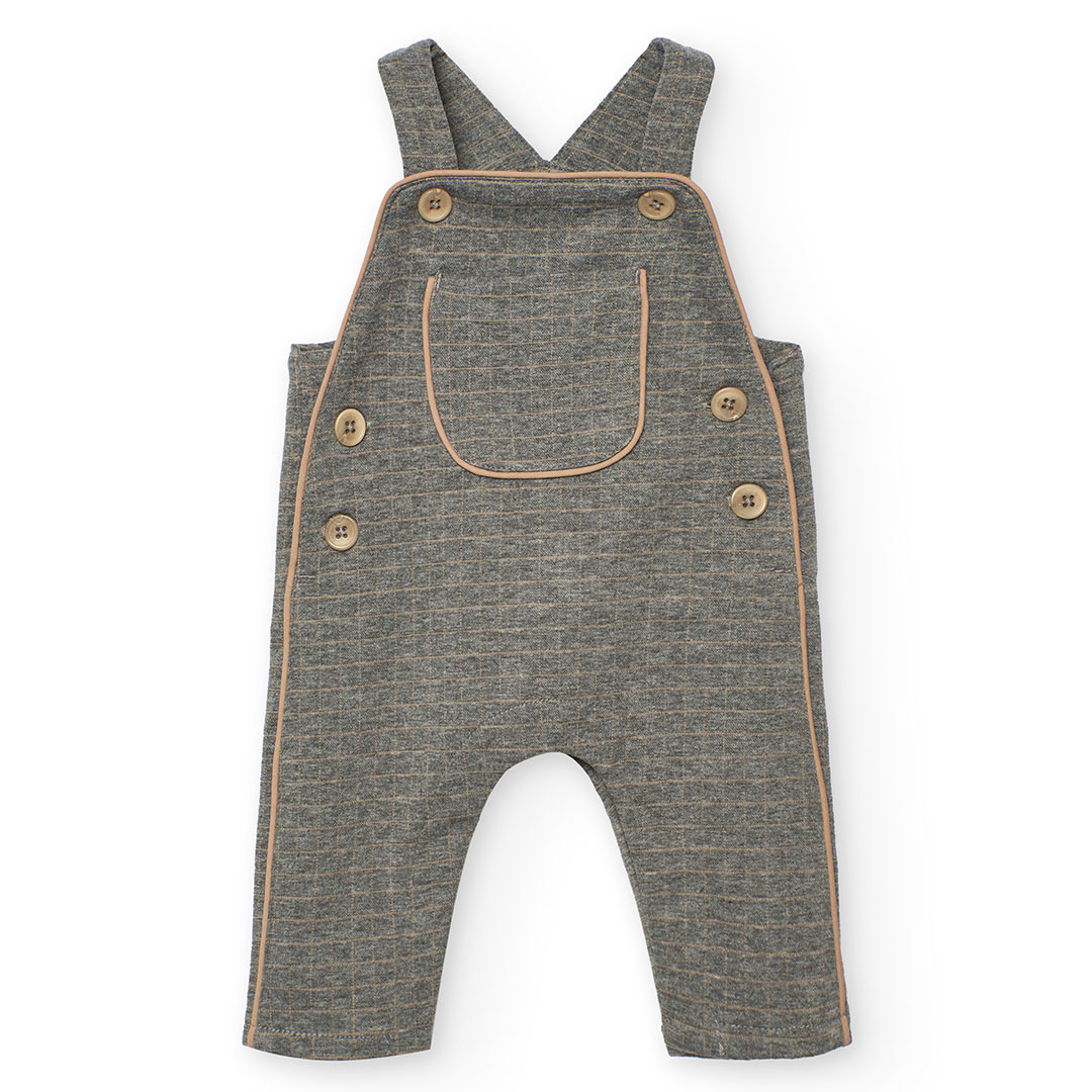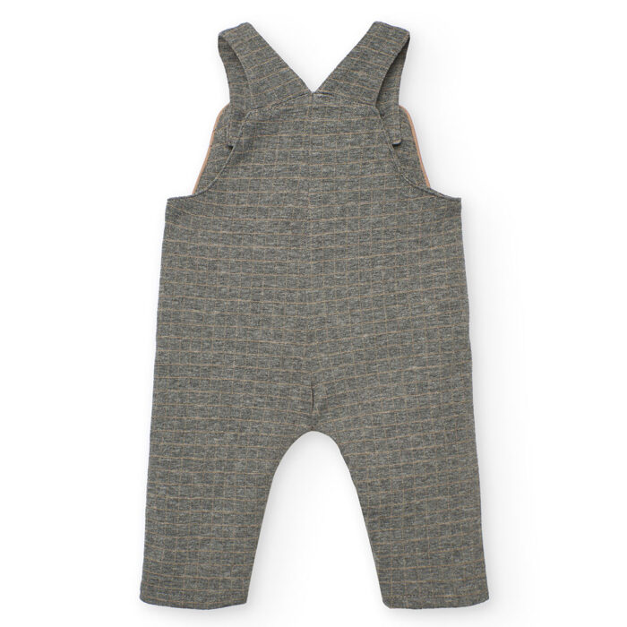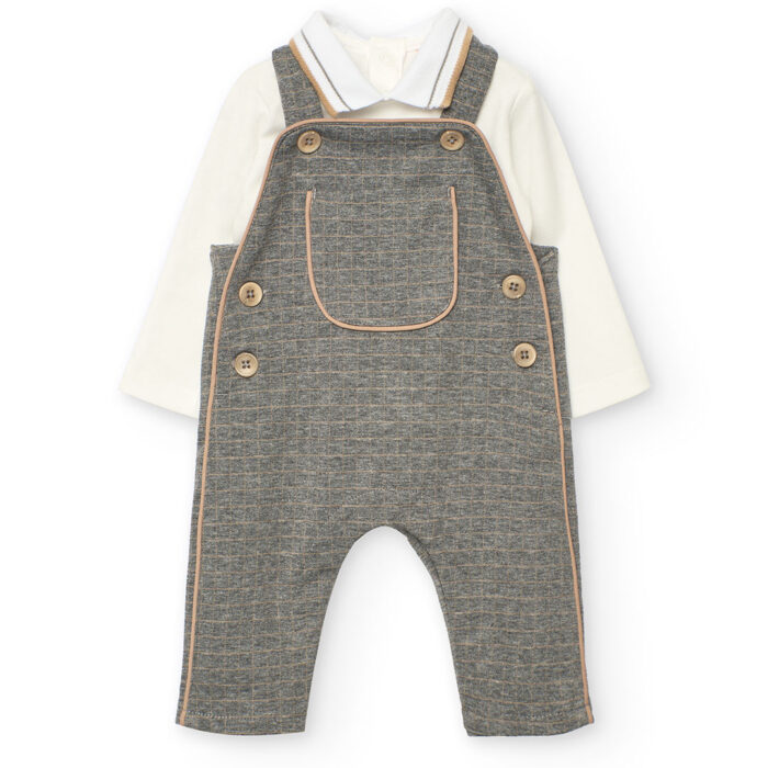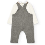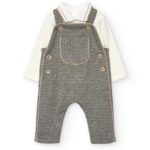 El peto largo cuenta con apertura en la entrepierna y tirantes con automáticos, facilitando el cambio de pañal y la colocación de la prenda. El body blanco complementa el conjunto, ofreciendo un look armonioso y delicado que combina funcionalidad con estilo.