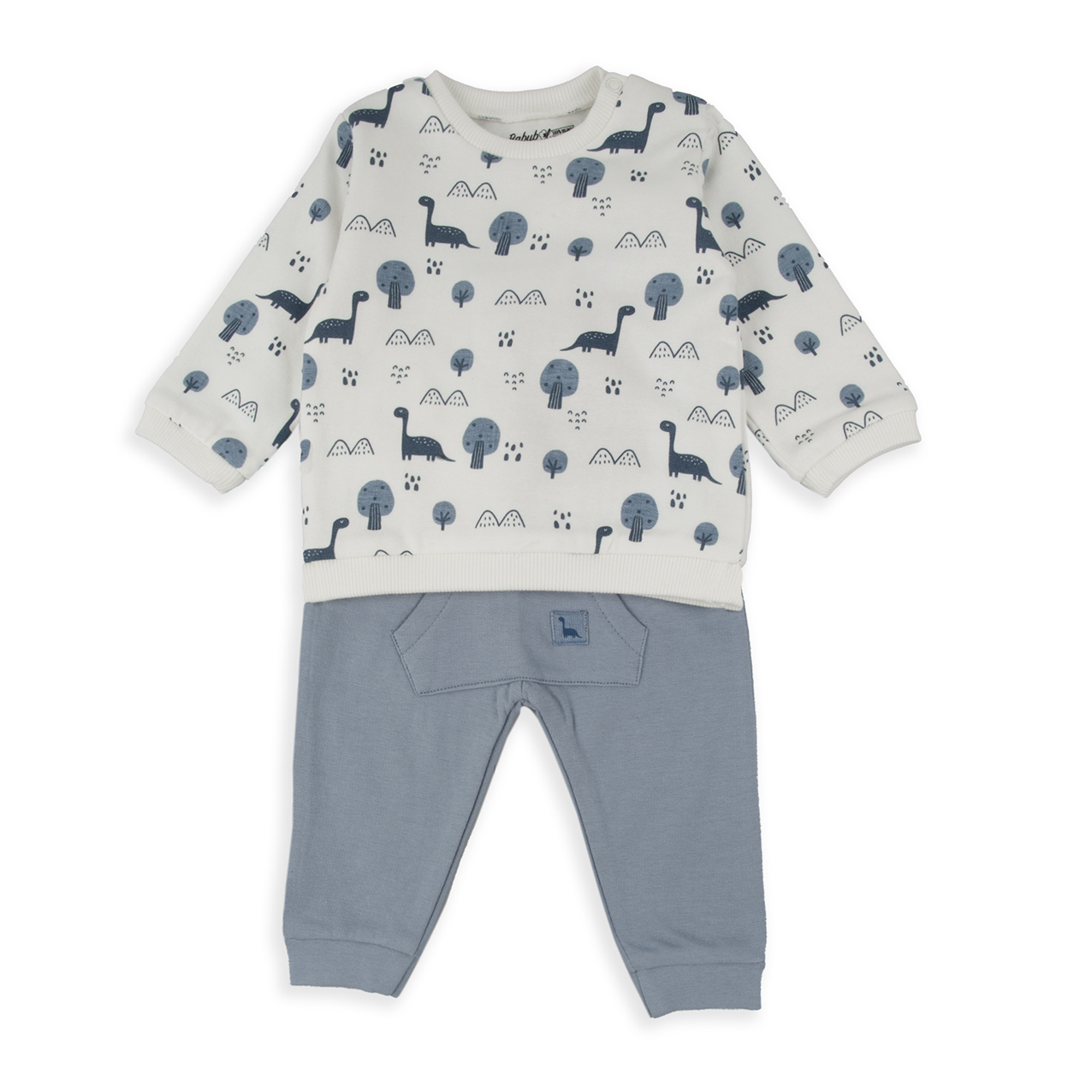 La sudadera presenta un estampado total de dinosaurios sobre fondo blanco, con apertura en el hombro mediante automáticos para hacer el cambio de ropa rápido y sencillo. El pantalón, en color azul liso, cuenta con cintura elástica que se adapta sin apretar, proporcionando bienestar absoluto a tu peque en cada movimiento.