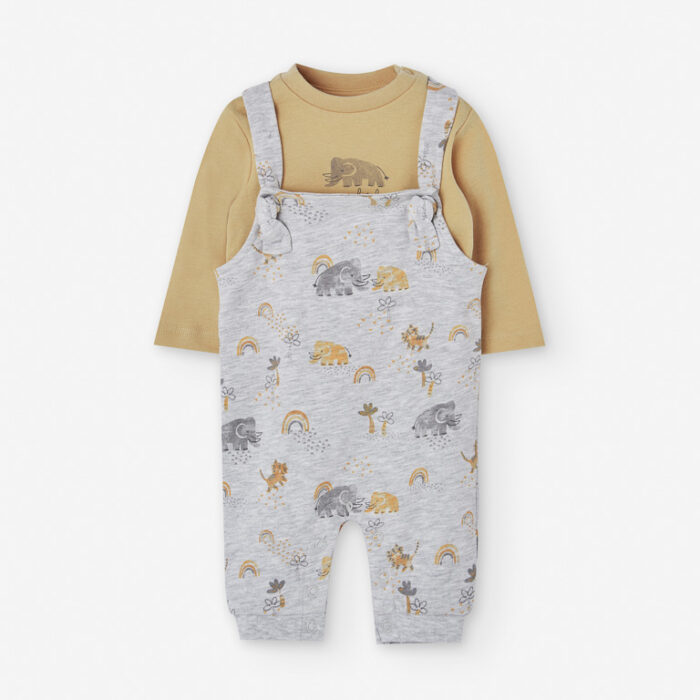 La camiseta mostaza destaca por su alegre estampado delantero con simpáticos animales, además de una práctica apertura en el hombro con automáticos que permite vestir al bebé de manera rápida y sencilla. El peto largo en color gris claro cuenta con un estampado total que aporta ternura y modernidad, mientras que sus cierres a presión en los tirantes y la entrepierna hacen más cómodo el cambio de ropa y pañal.