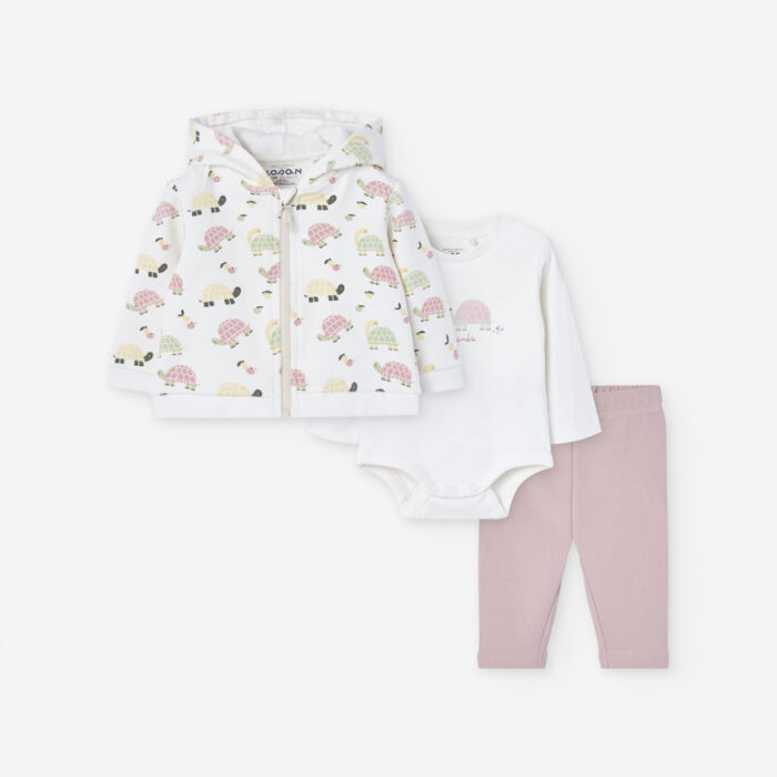 La chaqueta con capucha presenta un encantador estampado de animales sobre fondo en color crudo y se abre fácilmente con cremallera, perfecta para mantenerla abrigada en los días más frescos. El body de manga larga, también en tono crudo, incluye un dulce estampado delantero y cierre en la parte inferior para facilitar el cambio. El conjunto se completa con un pantalón largo en algodón color rosa palo, de cintura elástica, que aporta suavidad y comodidad durante todo el día.