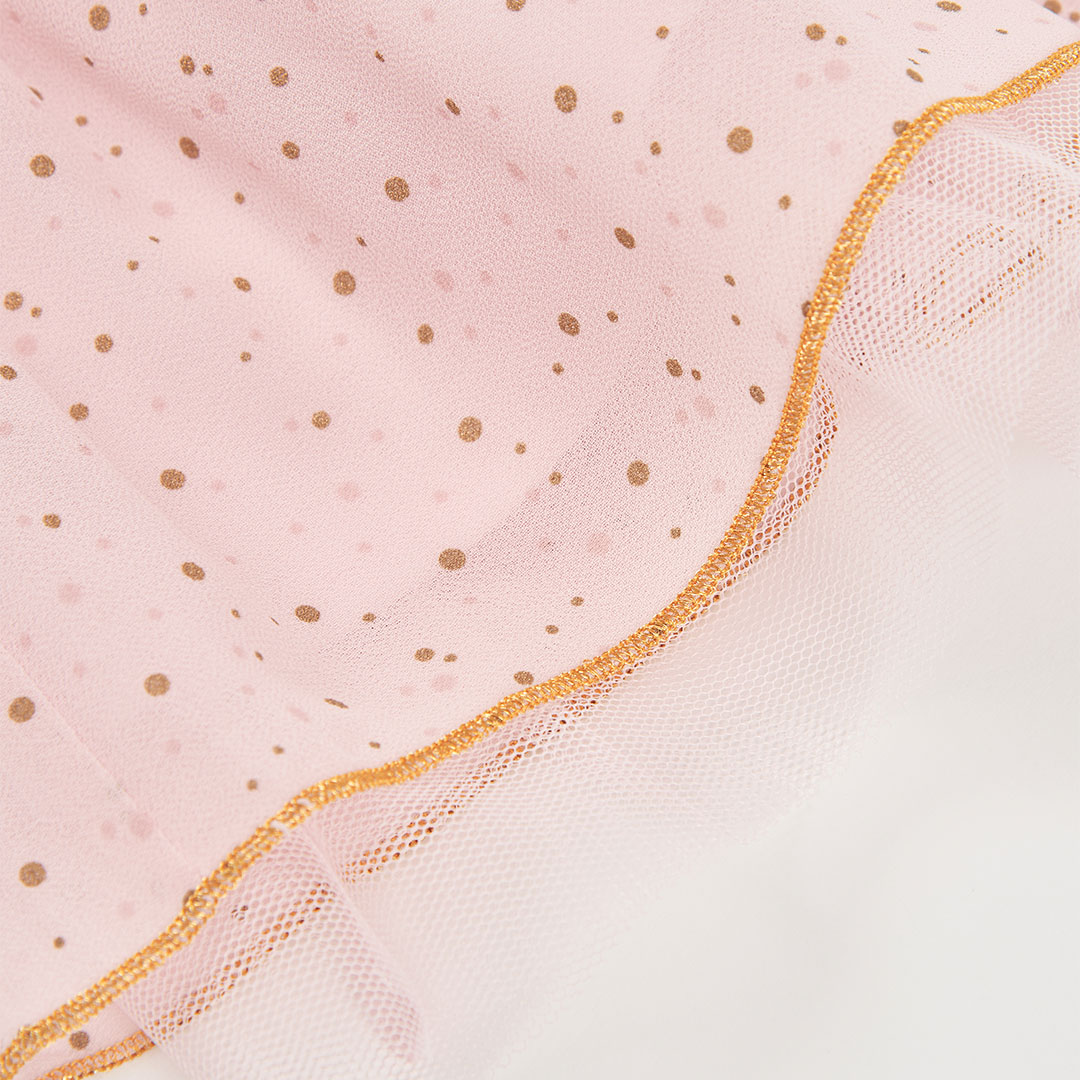 Su diseño ligero y vaporoso presenta un suave tono rosa con pequeños puntos dorados, un estampado sutil que aporta brillo y encanto sin perder la esencia infantil. El tejido de gasa le da un movimiento fluido y elegante, ideal para ocasiones especiales, celebraciones o para vestir con estilo en cualquier momento.