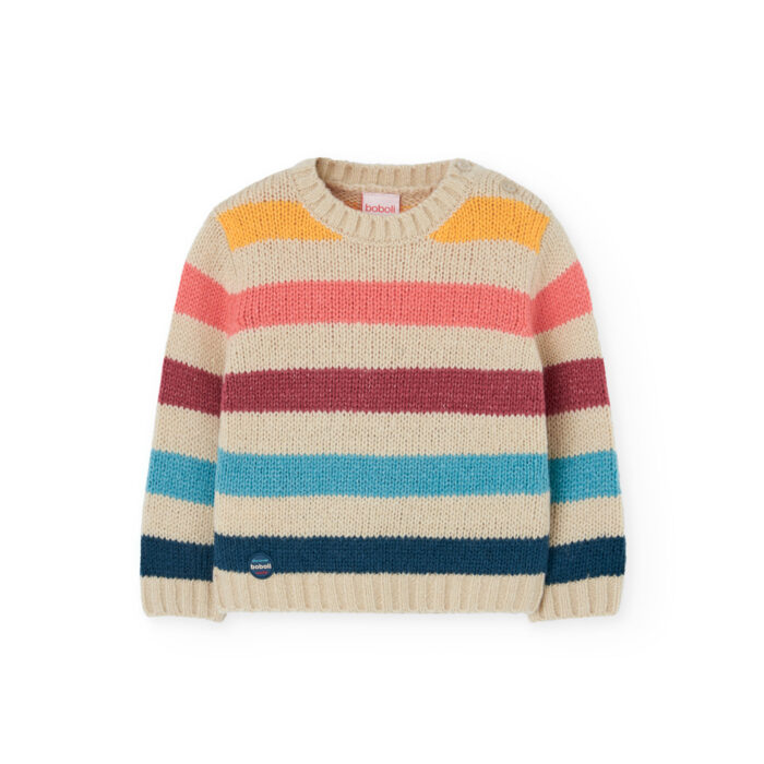 Jersey de punto a rayas beige para niño. Suave, cálido y elegante, ideal para otoño e invierno. Disponible de 3 a 7 años.