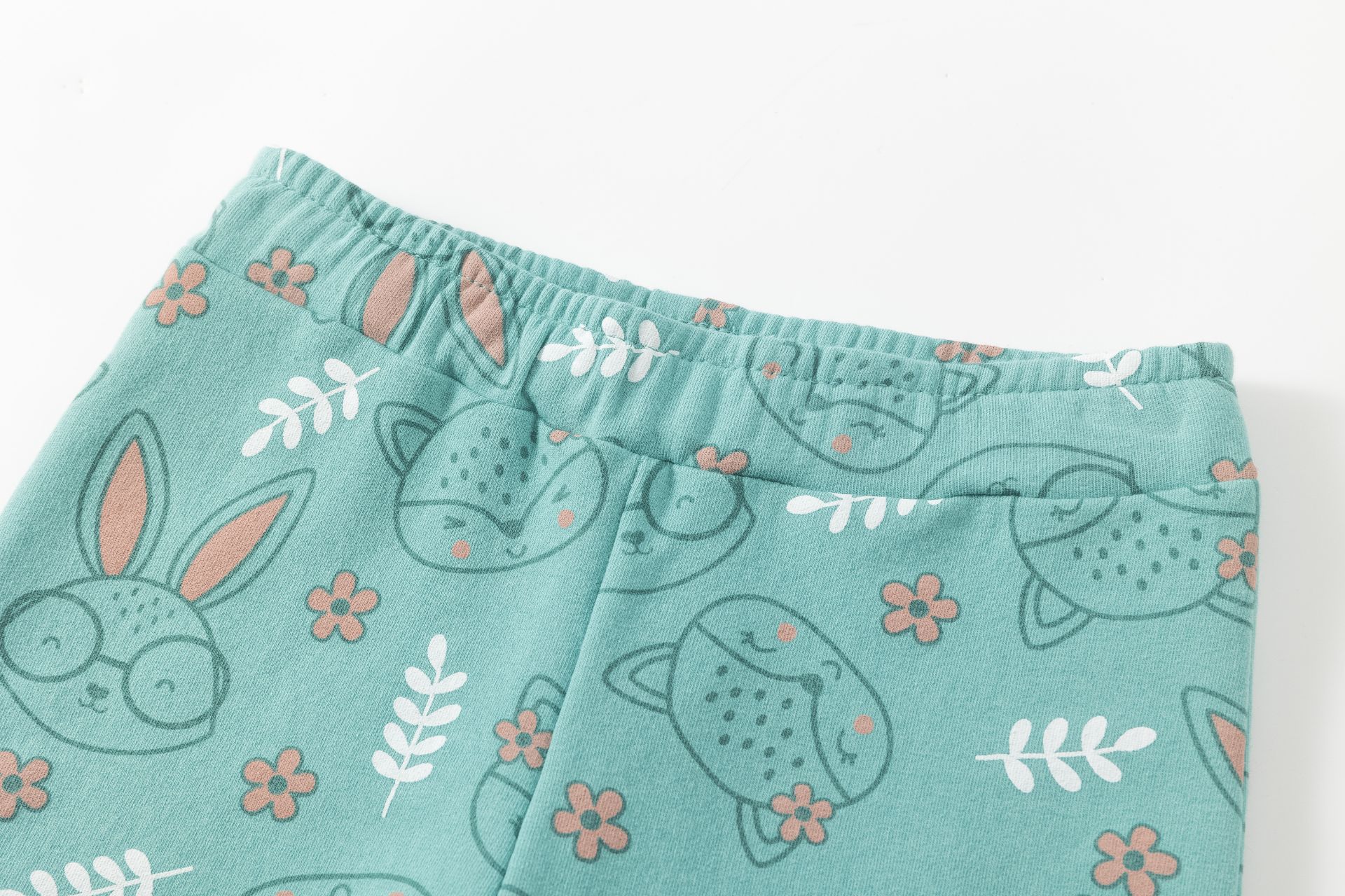 • Estampado total con conejitos y búhos sobre fondo verde claro.