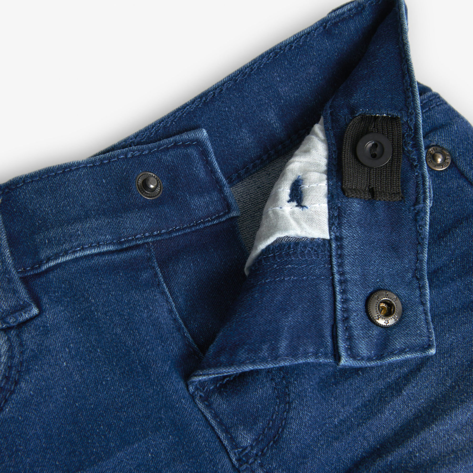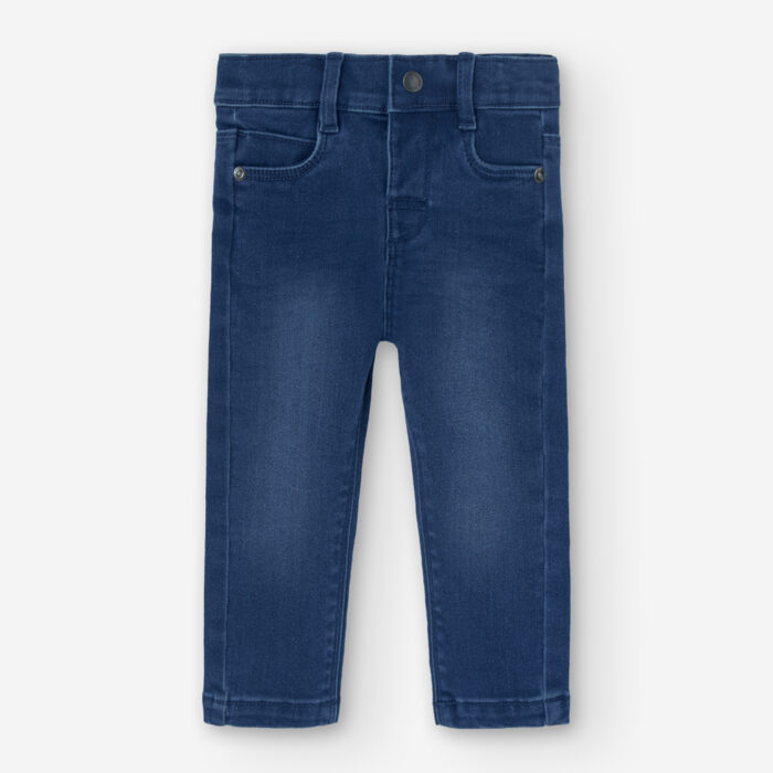 Gracias a su tejido con elastano, este vaquero ofrece movilidad y confort en el día a día. La cintura cuenta con goma de ojales y botón interior, lo que permite un ajuste adaptable a la silueta del niño. Además, el cierre a presión facilita el vestido diario, mientras que a partir de la talla 18 meses incorpora una cremallera en la bragueta para mayor practicidad.