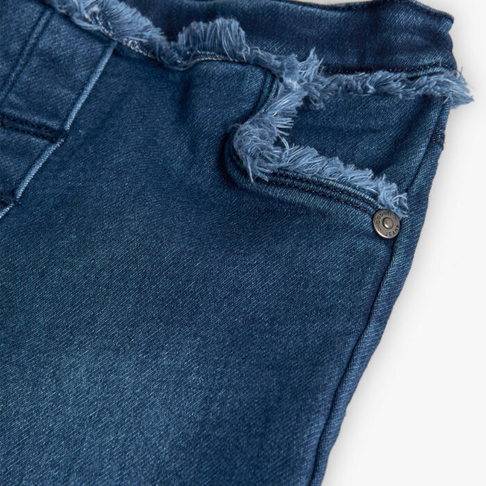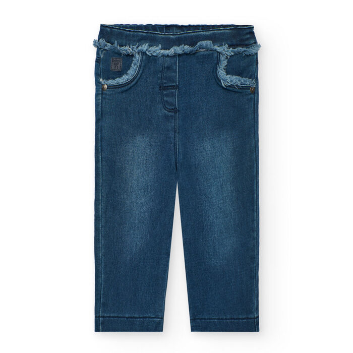 Pantalón denim azul para niña, cómodo y versátil. Tejido suave y elástico, perfecto para el día a día. Disponible en tallas de 3 a 7 años.