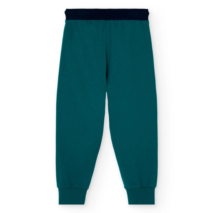 Pantalón largo de algodón para niño en verde con detalles azul marino. 100% algodón, cálido y versátil, perfecto para otoño e invierno. Tallas de 8 a 12 años.