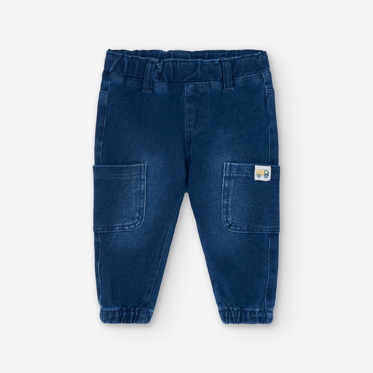 Cuenta con bolsillos laterales funcionales y una cintura elástica con botones interiores, que permiten un ajuste cómodo y adaptable al crecimiento del niño. Su tono azul denim lo convierte en una prenda versátil, fácil de combinar con camisetas, sudaderas o jerséis para lograr conjuntos llenos de estilo y confort.