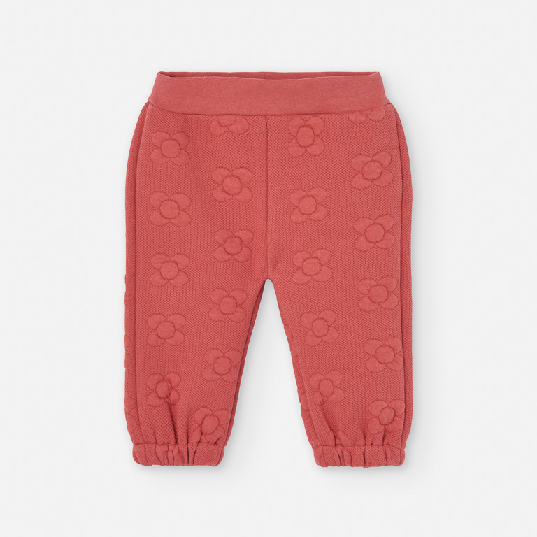 Su estampado total de flores en relieve sobre el fondo coral oscuro le da un toque encantador y moderno, aportando textura y un aire muy tierno a cualquier conjunto. Además, su cintura elástica garantiza un ajuste cómodo y seguro, adaptándose perfectamente al cuerpo del bebé sin apretar.