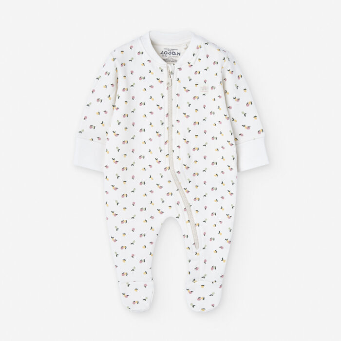 Su estampado total sobre fondo en color crudo le da un toque dulce y elegante, ideal tanto para dormir como para los momentos de descanso en casa. La apertura total delantera con cremallera facilita el cambio de ropa o pañal, haciendo que sea tan práctico como bonito.