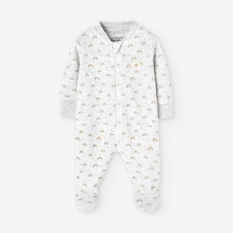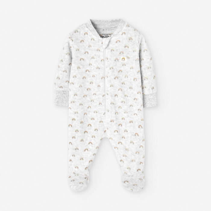 Su diseño encantador combina un estampado de arco iris sobre fondo gris claro, logrando un estilo alegre y tierno que aporta un toque de dulzura al vestuario infantil. Además, gracias a su apertura total delantera con cremallera y pies integrados, resulta muy práctico para vestir al bebé y facilita los cambios sin molestias.