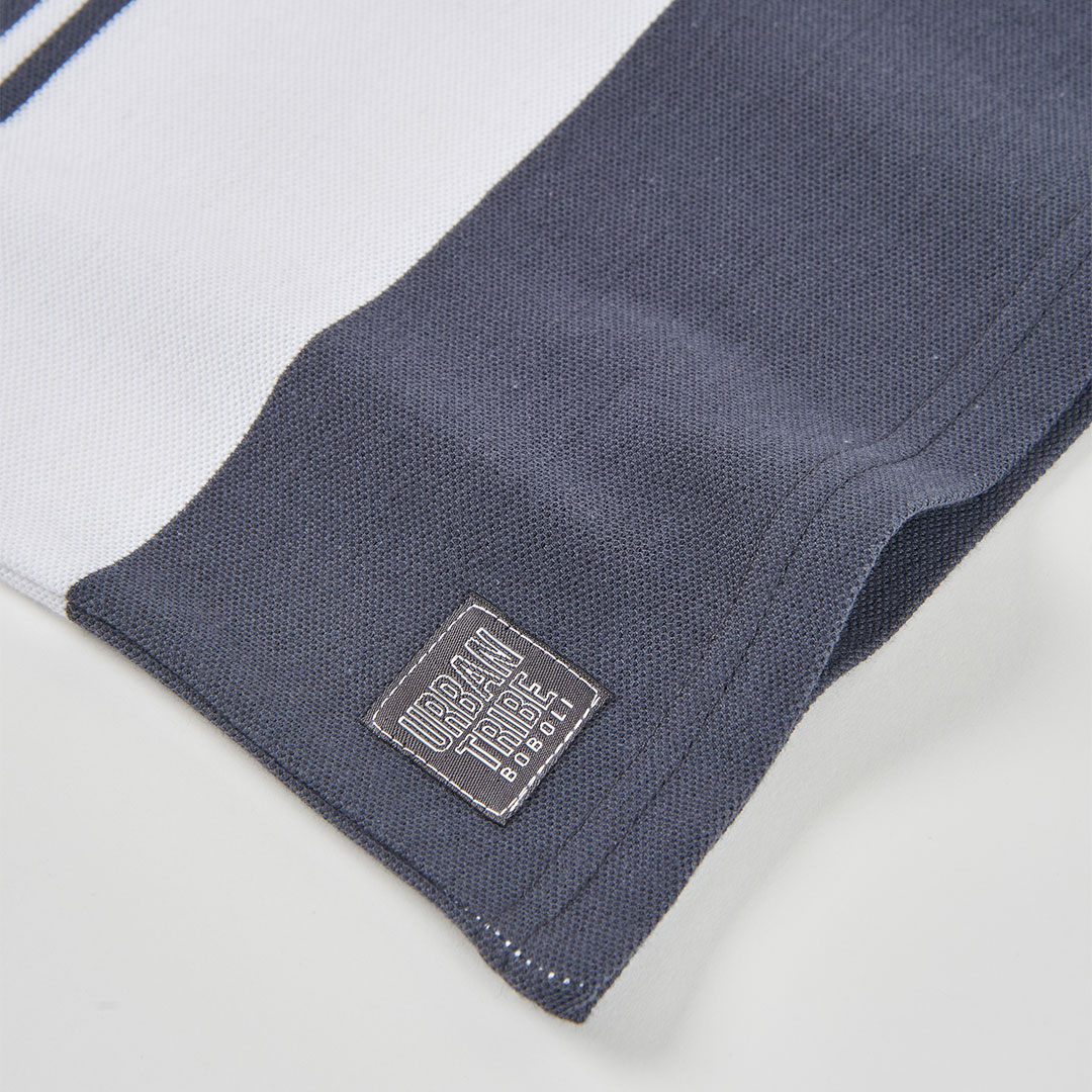 Su diseño destaca por las rayas horizontales en tonos azul, gris y blanco, una combinación clásica y atemporal que aporta un aire moderno y fácil de combinar. El cuello tipo polo y las mangas cortas le dan ese toque casual elegante que lo convierte en una prenda versátil para diferentes ocasiones.