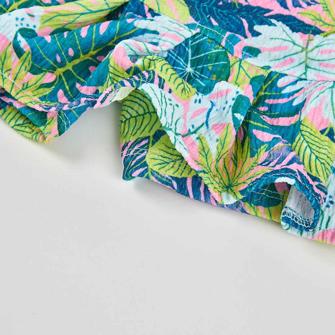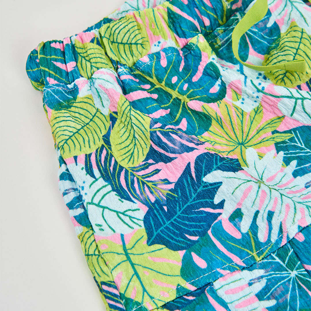 Esta falda y pantalón de punto para niña es una prenda perfecta para los días más cálidos, combinando comodidad, color y estilo en un diseño alegre y versátil. Su estampado tropical en tonos verde, azul y rosa aporta un aire fresco y divertido que llena de vida cualquier look infantil.