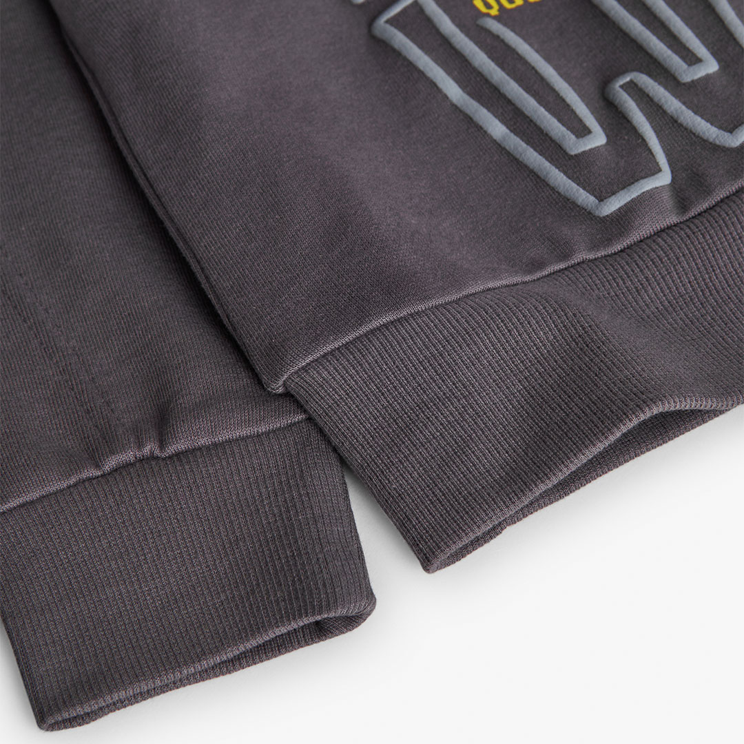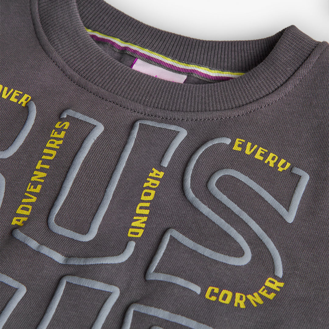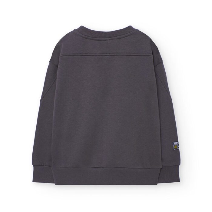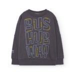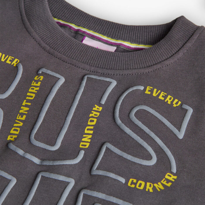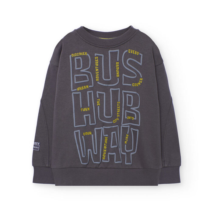 Su diseño moderno destaca por el estampado tipográfico en el frente, que añade un aire actual y urbano, ideal para niños con estilo propio. Además, cuenta con cuello redondo y mangas largas, asegurando un ajuste cómodo y práctico para el uso diario.