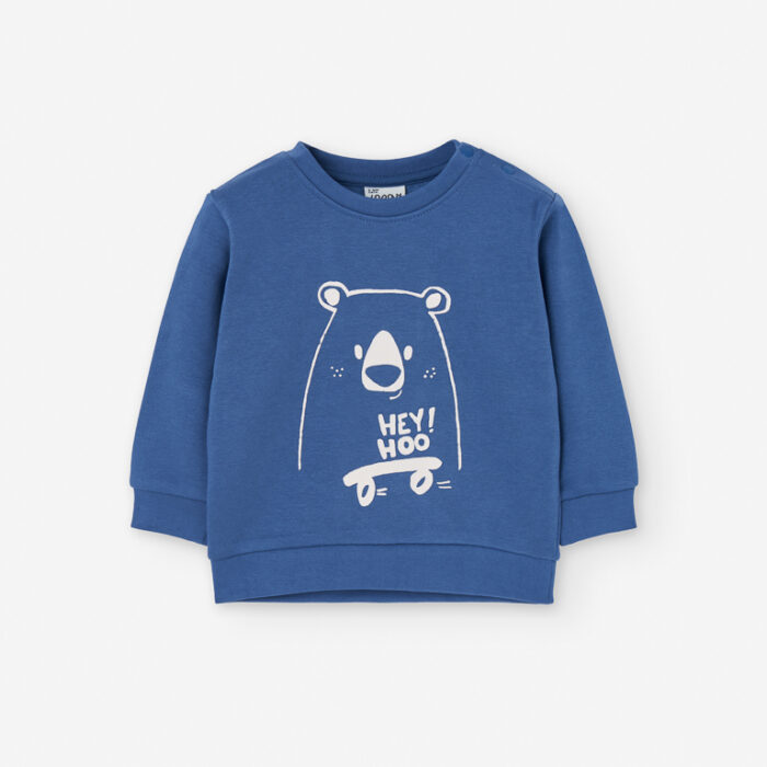 La sudadera Losan oso en azul para bebé niño es una prenda encantadora y muy cómoda, ideal para los días más frescos.