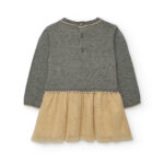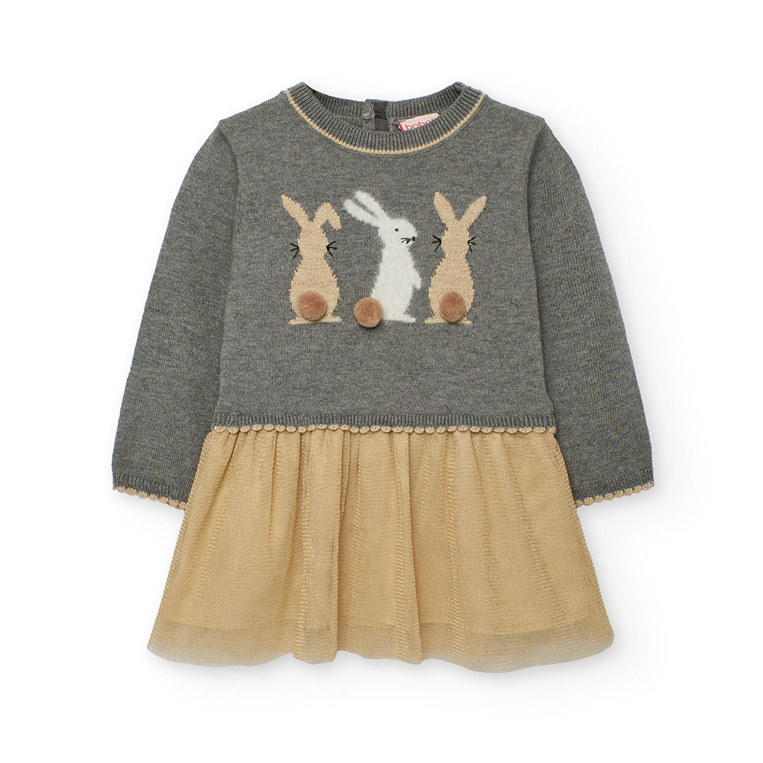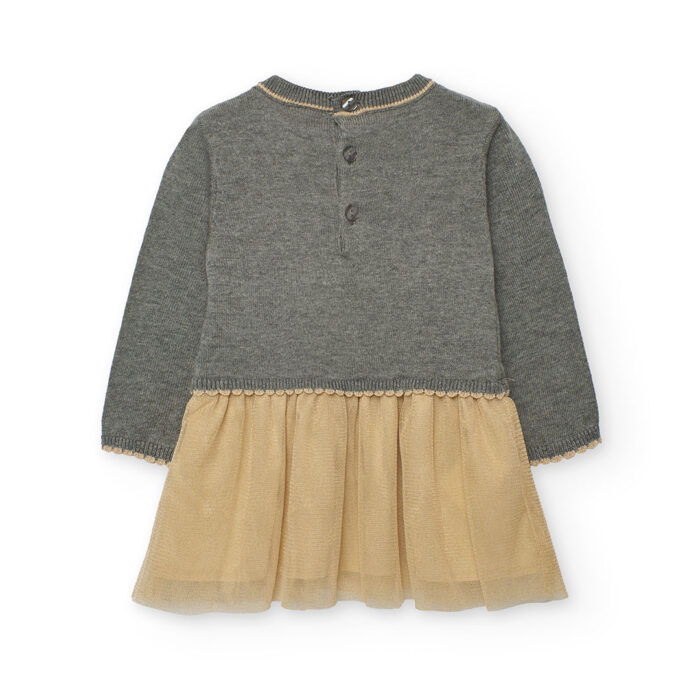 El vestido de punto gris con conejitos y falda de tul dorado es una prenda que combina estilo, ternura y practicidad, convirtiéndose en un imprescindible en el armario de tu pequeña para esta temporada.