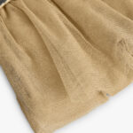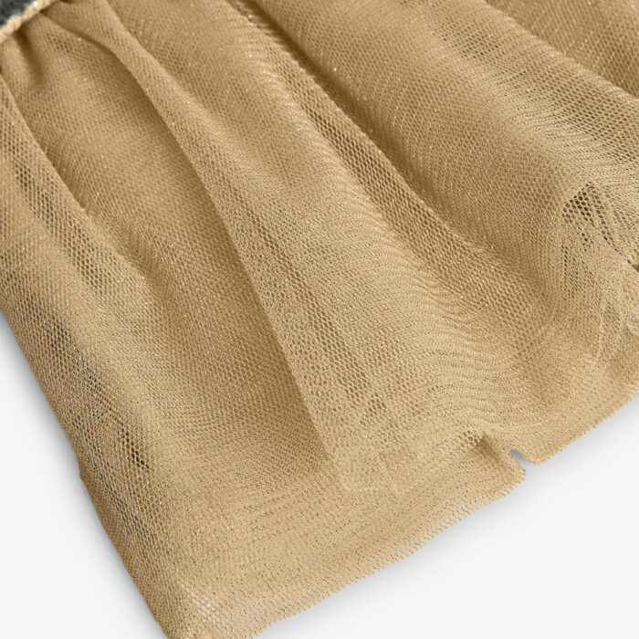 La parte delantera presenta un delicado bordado de conejitos en tonos grises y dorados, que aporta un aire divertido y entrañable. La falda de tul dorado con pequeños puntitos añade un toque de brillo y fantasía, haciendo de este vestido una pieza única que encantará a niñas y padres por igual.