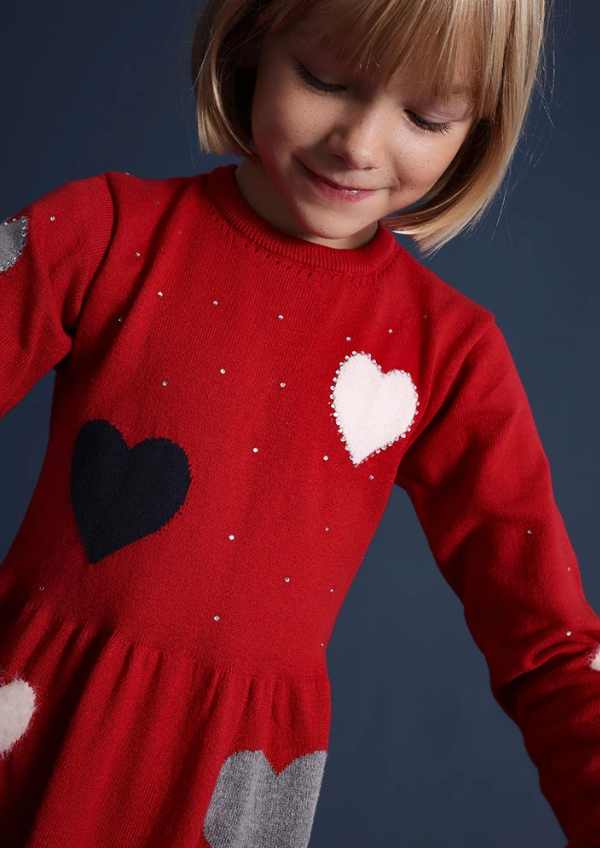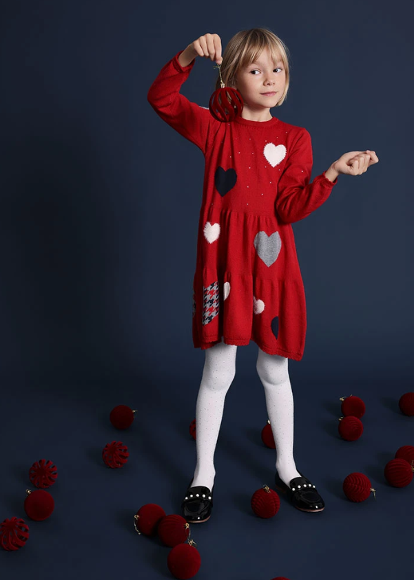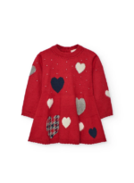 Este vestido de punto para bebé en color granate, decorado con delicados corazones, es una prenda ideal para la temporada otoño-invierno, combinando calidez, suavidad y un estilo encantador. Su diseño atemporal con cuello redondo y mangas largas proporciona abrigo adicional y una gran comodidad para el día a día de tu pequeña.