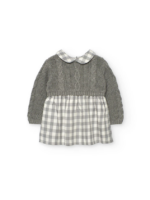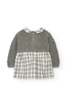 Este vestido para bebé en color gris con diseño de cuadros es una prenda atemporal que combina a la perfección estilo clásico, calidez y comodidad. Ideal para las temporadas de otoño e invierno, sus mangas largas y su suave tejido de punto mantienen a tu pequeña abrigada sin renunciar a la libertad de movimiento.