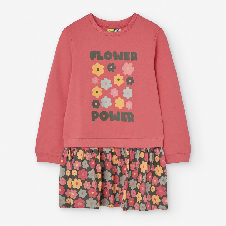 Vestido Losan coral para niña con estampado floral y efecto dos piezas. Algodón suave y cómodo. Disponible de 3 a 12 años en Diana23 Kids & 23Volteretas.